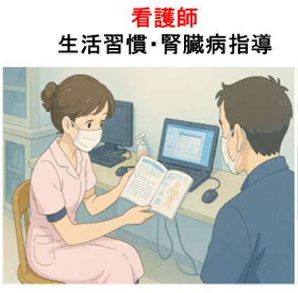 その間に、腎臓病の基本から腎代替療法までの説明指導、食事・生活習慣指導、薬物療法を行います。 - 6回の受診の後は、基本的には3か月から12か月に1度の定期診察を行います。