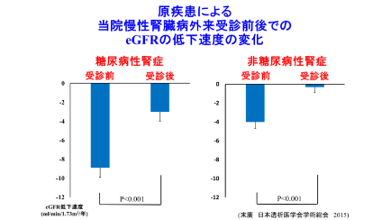 eGFRの低下が年間5.8ml/min/1.73㎡から1.1ml/min/1.73㎡に改善しました。また、この効果は糖尿病性腎症でも、非糖尿病性腎症の方でも認められました。
