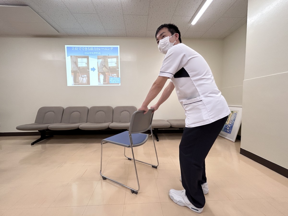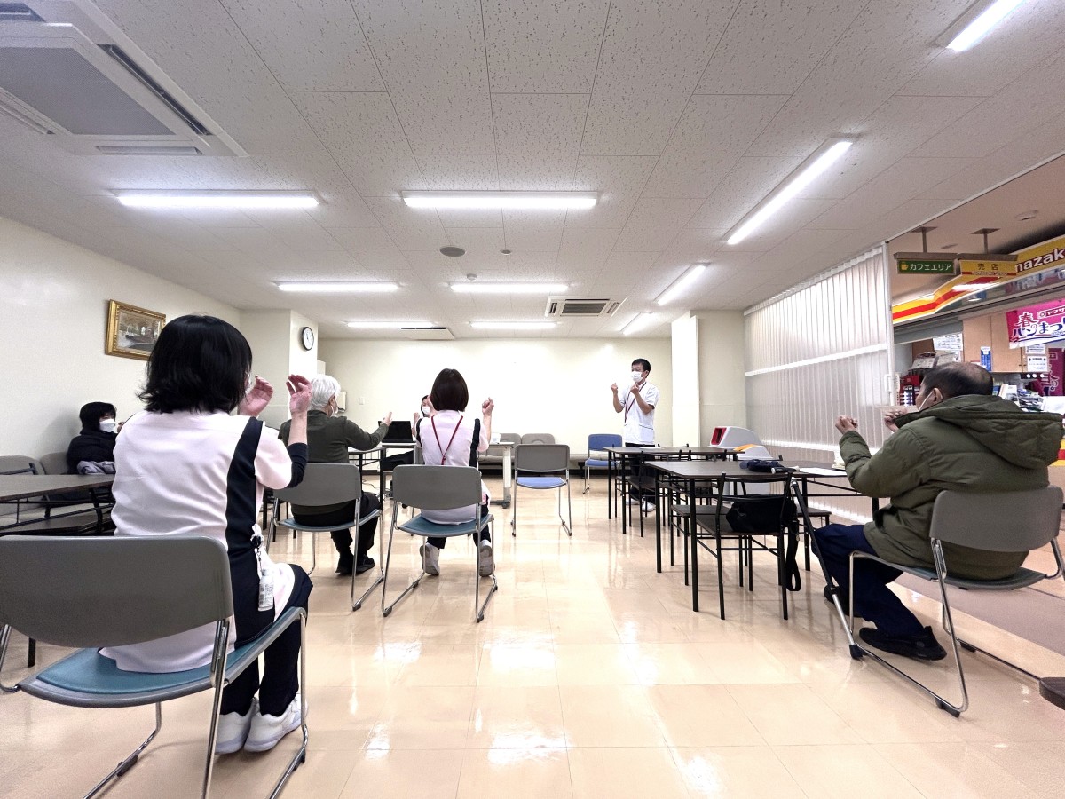 今回は「がんとリハビリテーション(リフレッシュのためのリハビリテーション)」をテーマに、当院の作業療法士が、ご自宅など日常生活の中で無理なく取り組める運動や体操について、実践を交えながらご紹介しました。参加された皆さまは、椅子に座ったままできる運動や身体をほぐす体操を実際に行い、和やかな雰囲気の中で交流を深められていました。