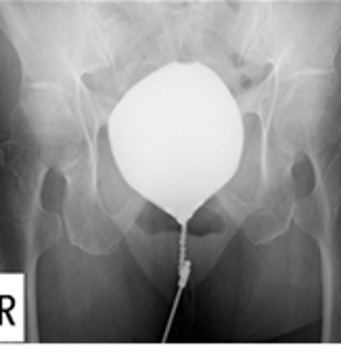 尿道に金属の鎖(チェーン)をいれ、膀胱内に造影剤1)を入れたまま撮影します。