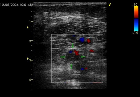 ⑤静脈を圧迫しながら超音波をあて、画像に映し出します。その画像に色をつけて見ることで、静脈内の血の流れや血栓の有無などを調べます。(深部静脈血栓症の診断)